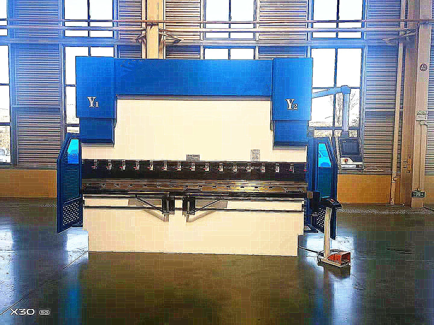 Mașina este o mașină CNC sincronă electro-hidraulică Y1, Y2, X, R, V 4+1 axe.