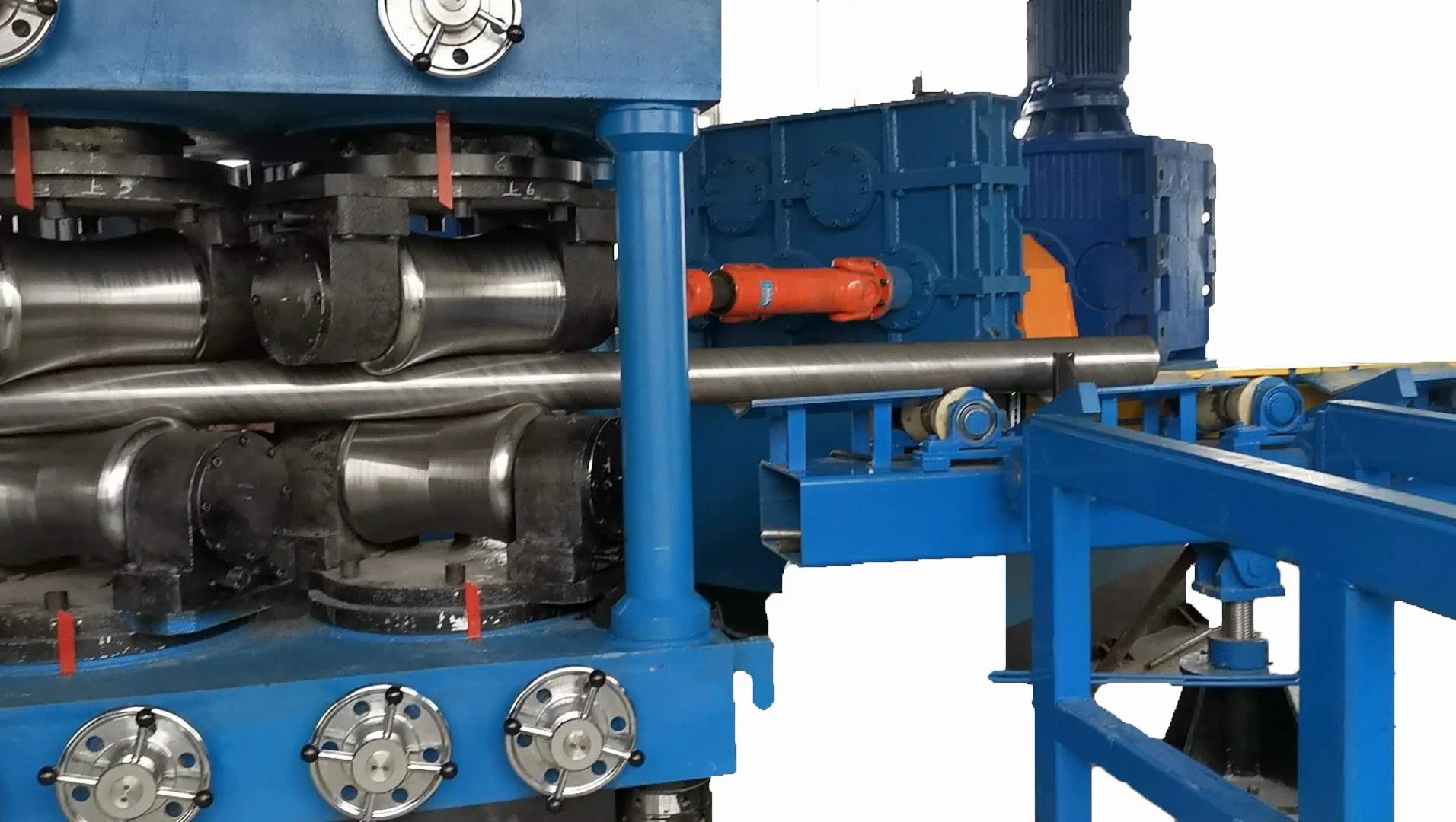strungul mașinii Parametri de îndreptare Material brut: diametru exterior D Φ70 ~ 180 mm Grosime de perete 5-10mm Limită de rulare: δs≤600N / mm2 Materail rolelor: 9Cr2MOV Debit de alimentare: V 5—8 m / mindreptitate: ≤1mm / M rolă diameter Diametru minim al gâtului × lungime) Φ314 × 520mm Distanța dintre role 900mm Mod de amenajare a rolelor 2-2- 1-1-1-2-2 Gama de reglare a înclinării rolei: B 32 ° ~ 34 ° Modelul motorului rolei de acționare: Y280M -4 putere: 55KW * 4 Motor pentru reglarea înălțimii rolei: Y90L-4 1,5KW * 6 Îndoirea maximă a materialului înainte de îndreptare ≤10mm / m Lungimea totală este de 8 metri, un total de 7 cadre, cu o sarcină de 10 tone. suprafața mașinii principale : 12500mmx4900mm Greutatea mașinii principale (pentru referință): 100T Lungimea de încărcare a amplificatorului &; mașină de descărcat: 9000 mmx5000mm Greutatea mașinii auxiliare (pentru referință): 5T Suprafață totală a podelei: 25000mmx5000mm Putere totală: 220kW Alimentare: 380V 50Hz (furnizat de utilizator) Aer comprimat (furnizat de utilizator)